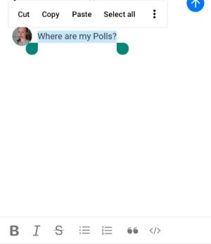 Bold, Italic, Strikethrough (always fun) as well as a bulleted or numbered list and a quote option. No polls yet though (sigh).
